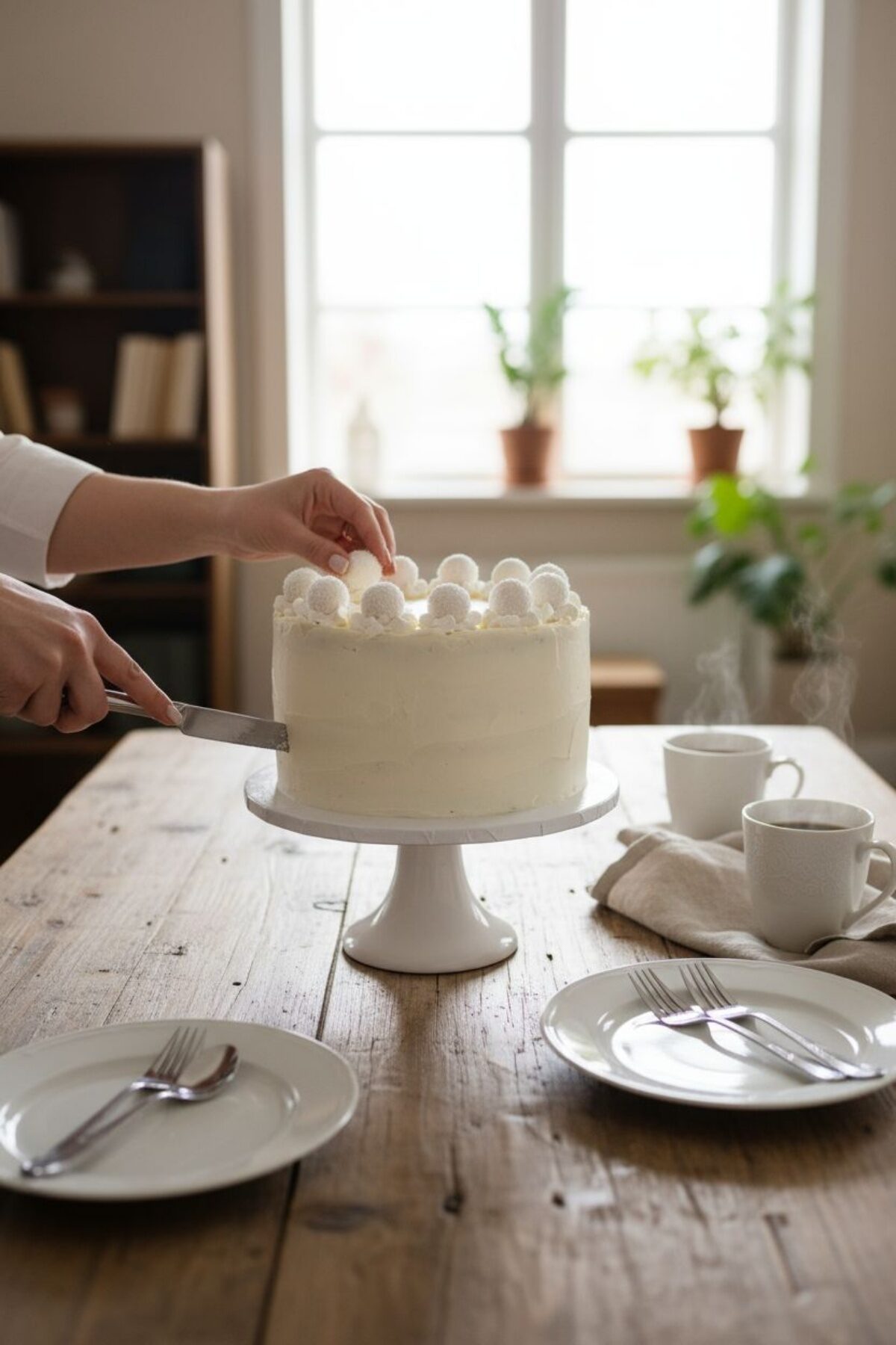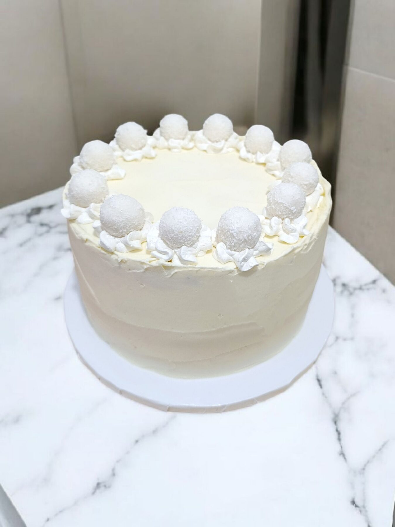 Торта "Рафаело" е приготвена с ванилови блатове, бял шоколад и кокос. Диаметърът на тортата е 19см.