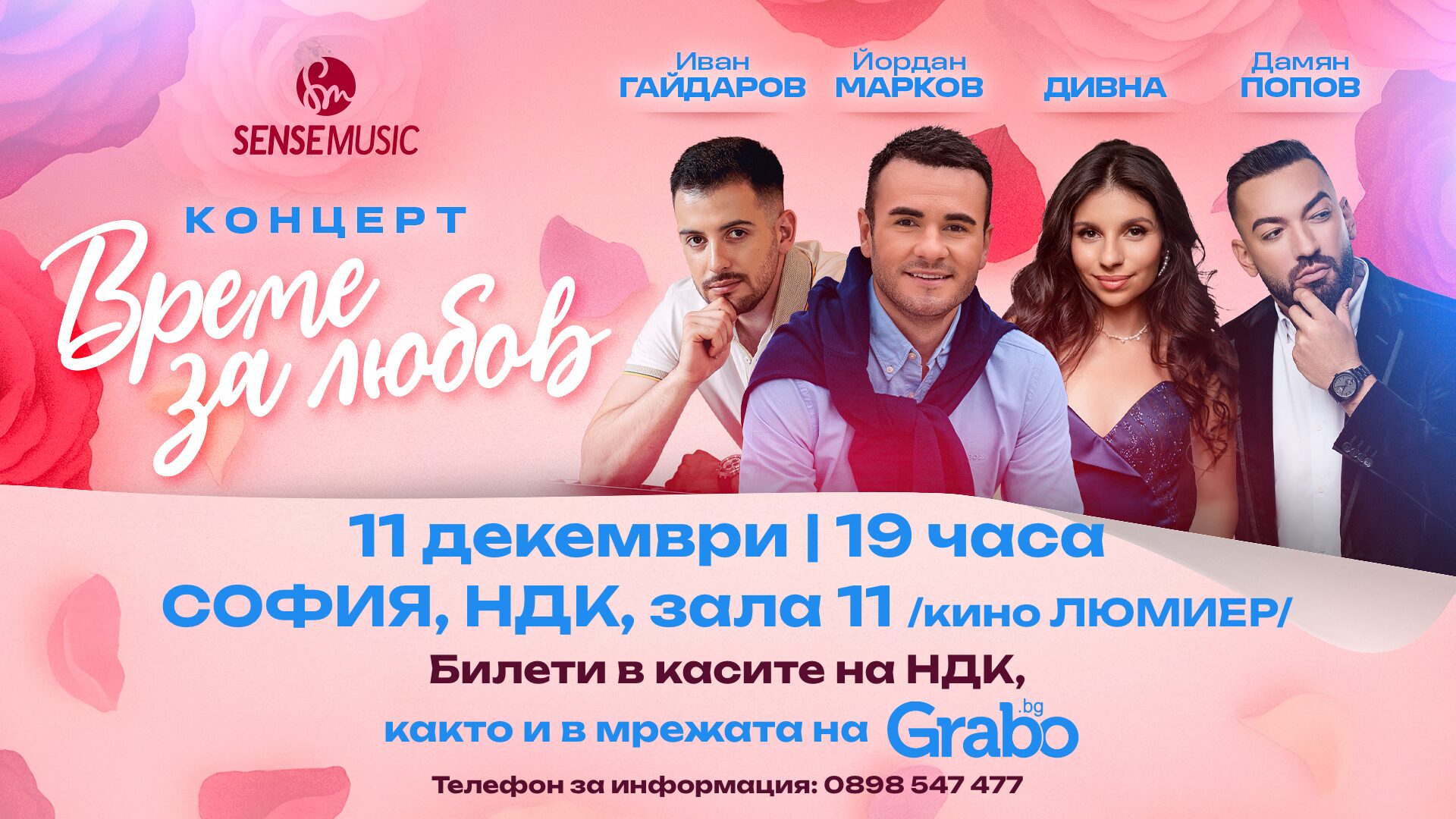 Концертът "Време за любов" с Йордан Марков, Дивна, Иван Гайдаров и Дамян Попов на 11 Декември, в Кино Люмиер, София