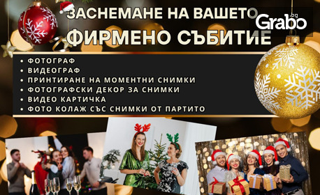 | Пакет Премиум Ultra - един професионален фотограф плюс фотоколаж със снимки от събитието, разпечатан на формат А2 и моментен печат на снимки до 50 броя, и един професионален видеограф, плюс видео картичка с пожелания от екипа (120 минути) | 955.50 лв/488.54 € плати сега 382.20 лв / 195.42 € | Грабни |