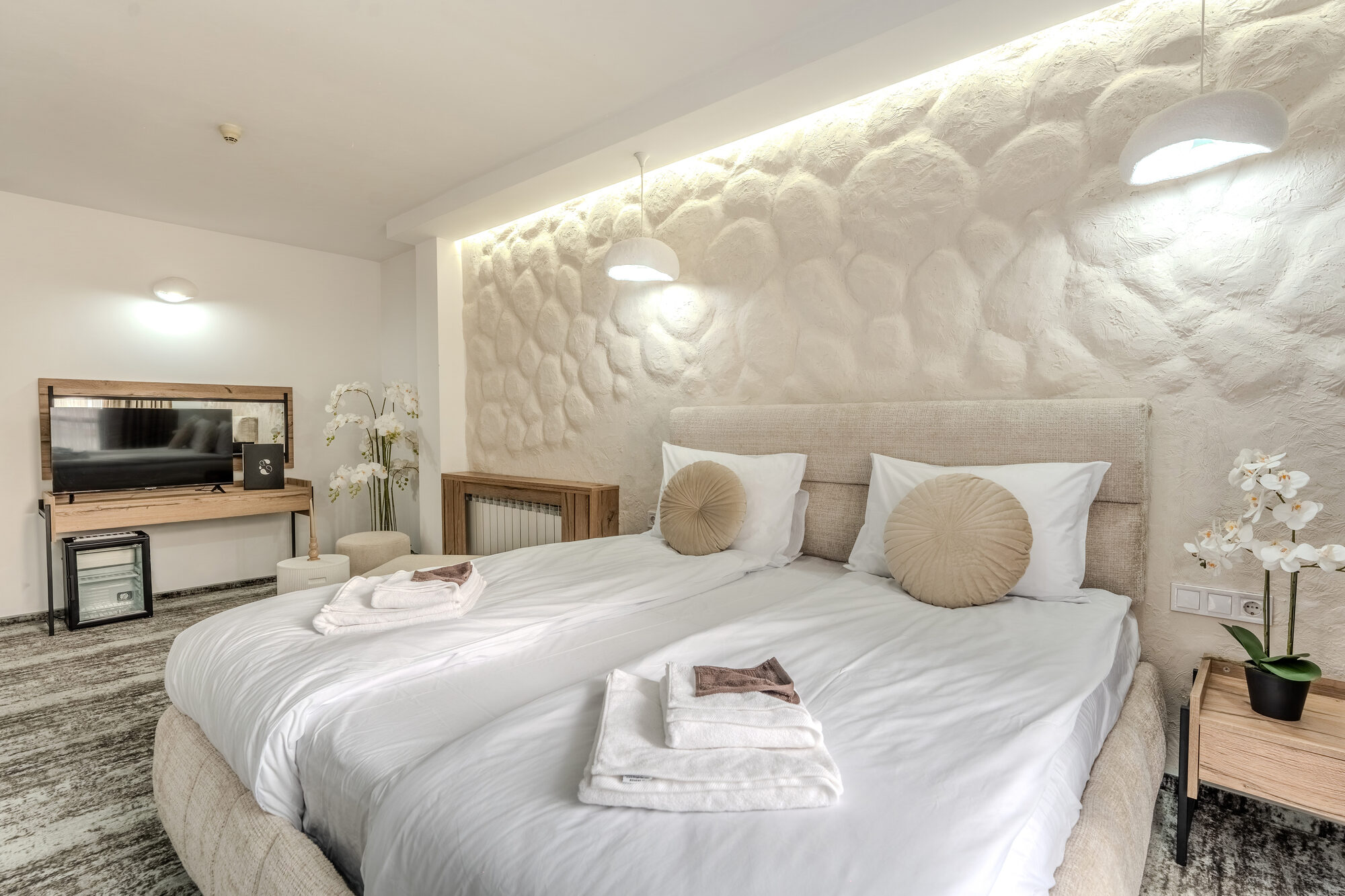 Апартамент Делукс: Апартаментът гарантира луксозен семеен престой с две отделни помещения, осигуряващ уединение и простор. Модерно и стилно пространство, излъчващо баланс и спокойствие, с възможност за настаняване на до четирима гости. 1 или 2 спални / 1 спалня + единично легло / 1 спалня + разтегателен диван (до 4 възрастни).