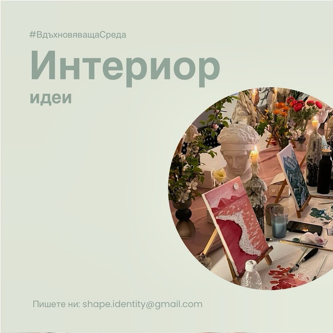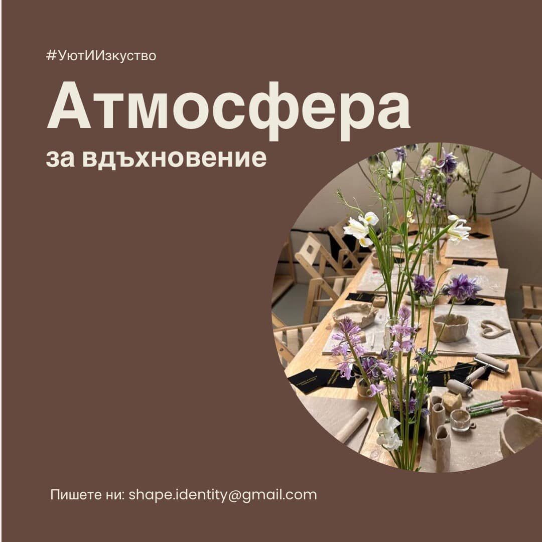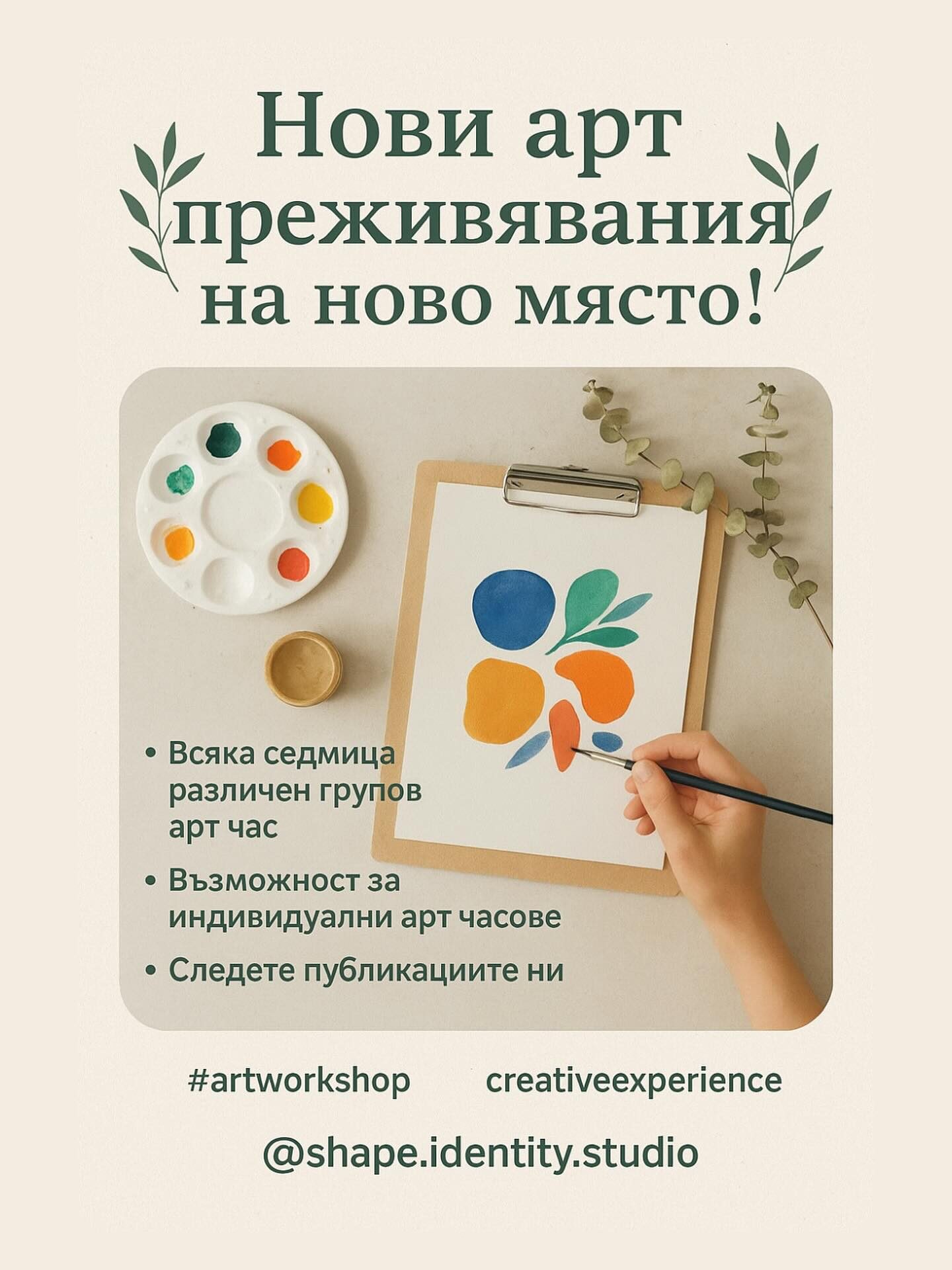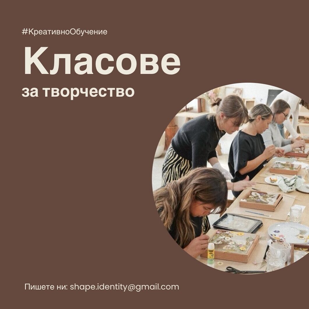 Арт студио Shape Your Identity предлага творчески занимания и арт събития в уютна и вдъхновяваща атмосфера, с включени материали, напитка и лек кетъринг. Участниците могат да избират между различни техники - макраме, изработка на свещи, рисуване върху платно или текстил, декорация с кристали, работа с епоксидна смола, изработка на бижута, мозайка, бродерия и други. Всяко събитие се води от арт водещ, който осигурява индивидуално внимание, насоки и подкрепа през целия процес. Подходящи са за всеки, който иска да се потопи в творческа атмосфера и да създаде нещо свое.