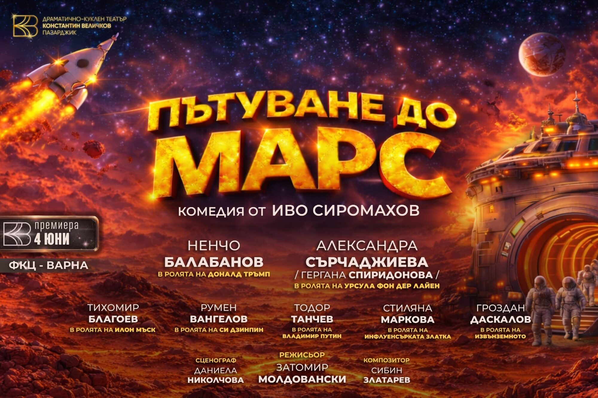 Тази шеметна комедия, под режисурата на Златомир Молдовански, със сценография на Даниела Николчова и музика на Сибин Златарев, превръща сцената в космическо приключение, в което егото и човешките амбиции се сблъскват далеч отвъд пределите на Земята.