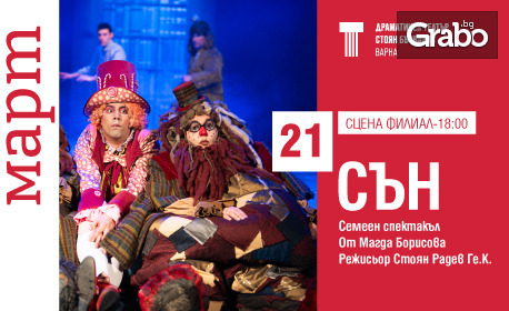 | Постановката "Сън" на 21 Март от 18:00ч, на Сцена Филиал в ДТ "Стоян Бъчваров" | 10.20 €/19.95 лв | Грабни |