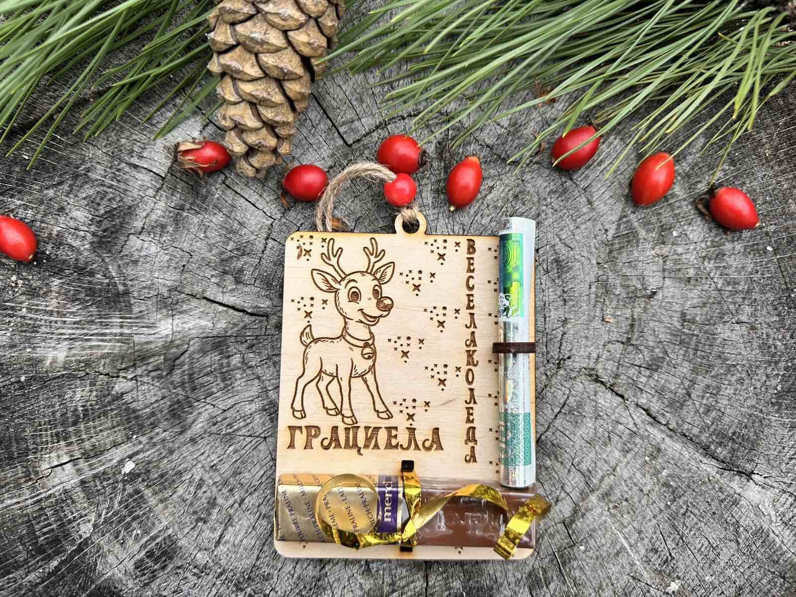 1 брой висулка за елха с място за банкнота и бонбон "Еленче" | 5.00 лв/2.56 € | Грабни |