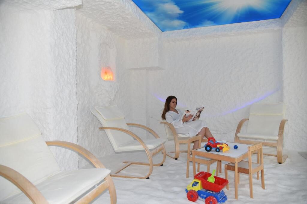 • Солна стая - оборудвана с халогенератор, подходяща при кожни заболявания, стрес, безсъние и хронична умора с благоприятно действие върху дихателната система. Солната стая е идеално място за малките ни гости, съчетавайки игра и здраве, и превръщайки престоя на децата там в забавни и полезни моменти.