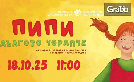 Детският спектакъл "Пипи дългото чорапче" на 18 Октомври от 11:00 в МДТ "Константин Кисимов" | 6.00 лв/3.07 € | Грабни |