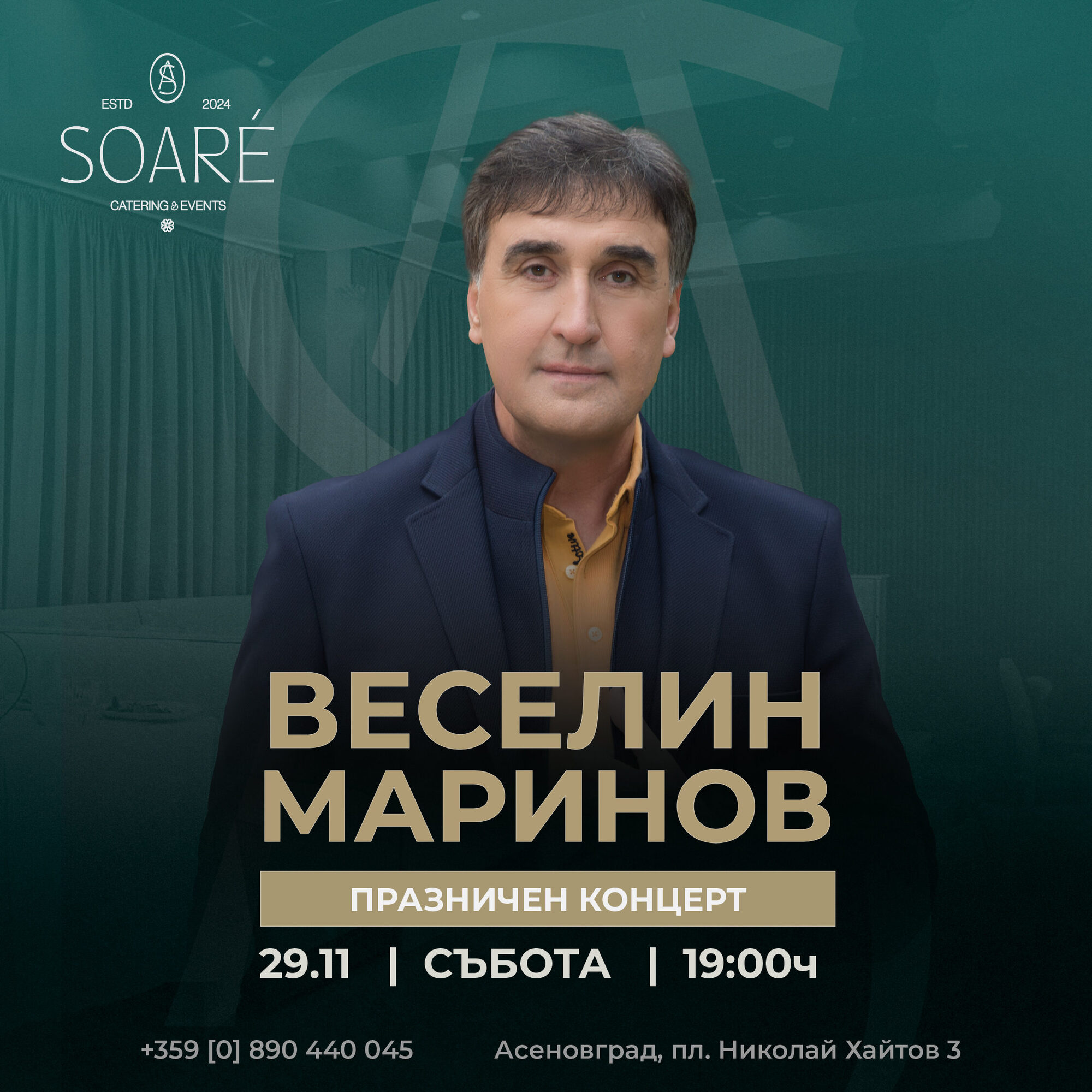 Празничен концерт на Веселин Маринов, плюс лек кетъринг на 29 ноември, в SOARÉ - Асеновград