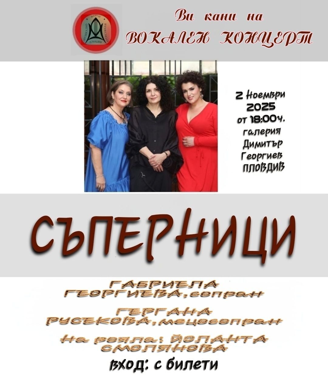 Вокалният концерт "Съперници" в изпълнение на Габриела Георгиева и Гергана Русекова, на рояла Йоланта Смолянова - на 2 Ноември в Галерия "Димитър Георгиев" в Стария град